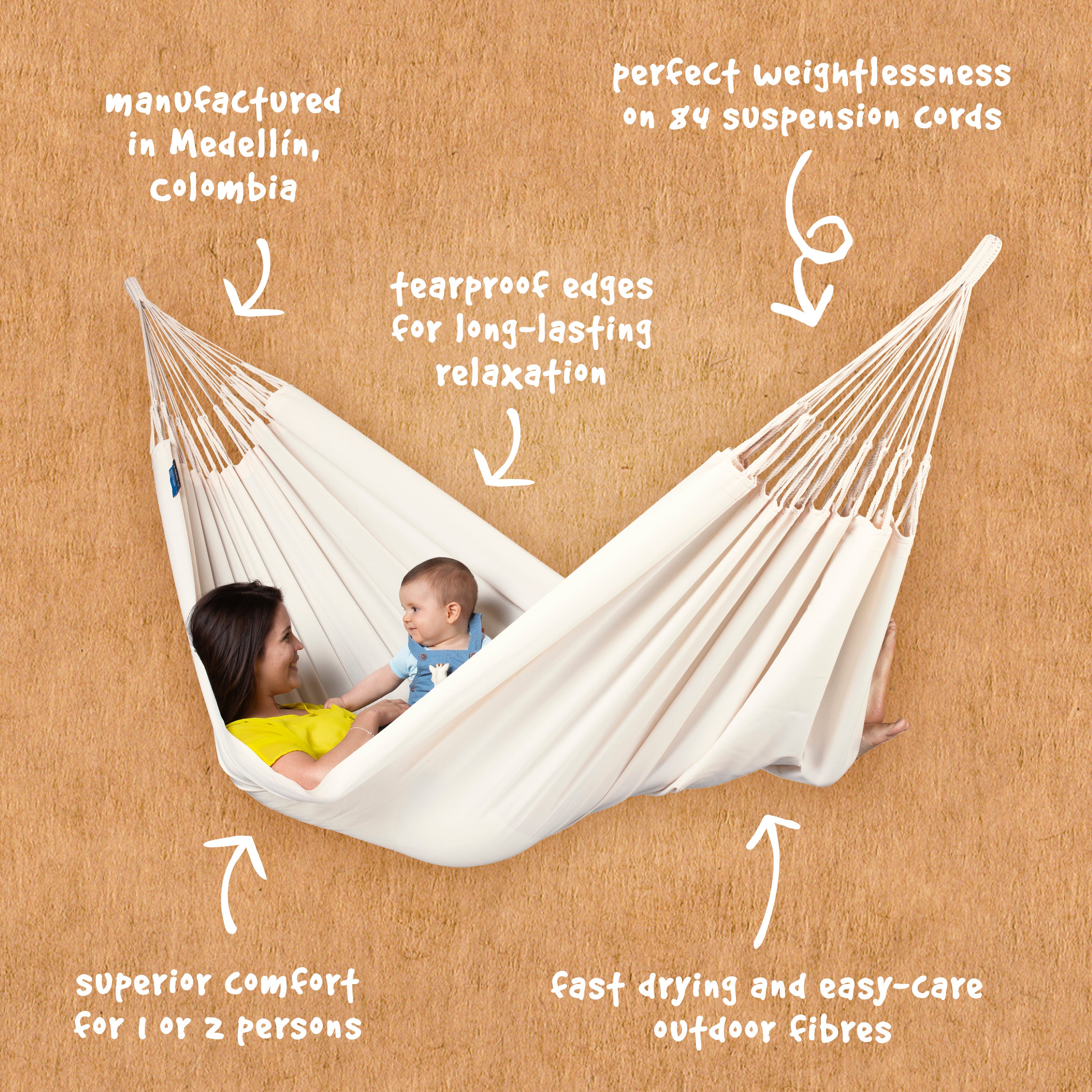 Its quick-drying, easy-care material ensures long-lasting performance outdoors, while multiple suspension cords provide balanced support and superior comfort.